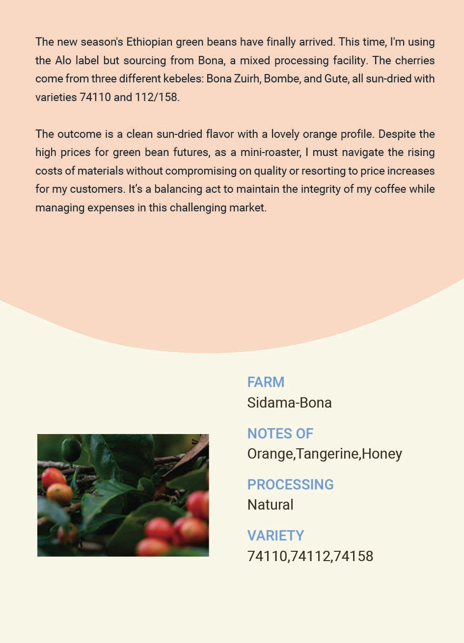The new season's Ethiopian green beans have finally arrived. This time, I'm using the Alo label but sourcing from Bona, a mixed processing facility. The cherries come from three different kebeles: Bona Zuirh, Bombe, and Gute, all sun-dried with varieties 74110 and 112/158. The outcome is a clean sun-dried flavor with a lovely orange profile. Despite the high prices for green bean futures, as a mini-roaster, I must navigate the rising costs of materials without compromising on quality or resorting to price increases for my customers. It’s a balancing act to maintain the integrity of my coffee while managing expenses in this challenging market.