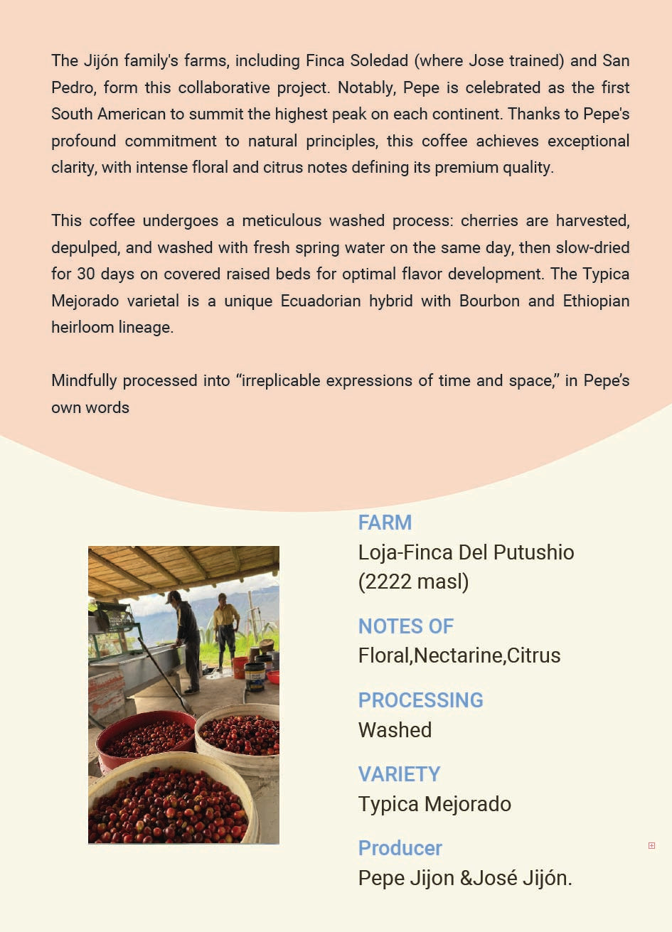 The Jijón family's farms, including Finca Soledad (where Jose trained) and San Pedro, form this collaborative project. Notably, Pepe is celebrated as the first South American to summit the highest peak on each continent. Thanks to Pepe's profound commitment to natural principles, this coffee achieves exceptional clarity, with intense floral and citrus notes defining its premium quality.